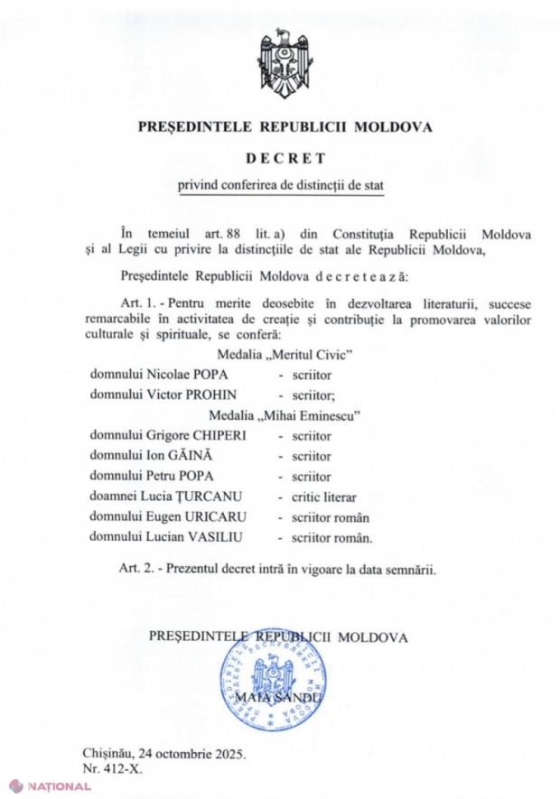 Maia Sandu onorează scriitorii și criticii literari cu distincții naționale pentru contribuții culturale remarcabile