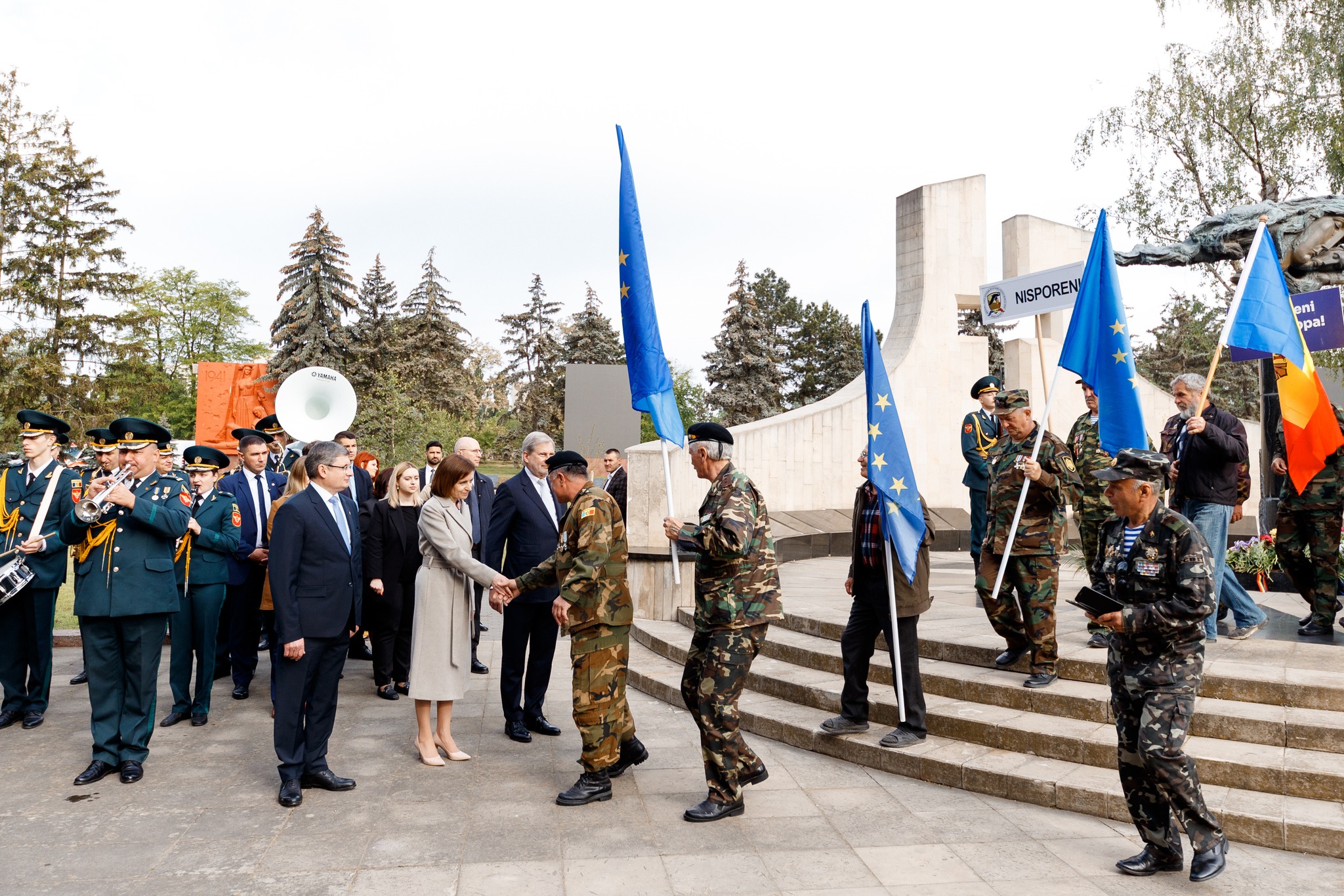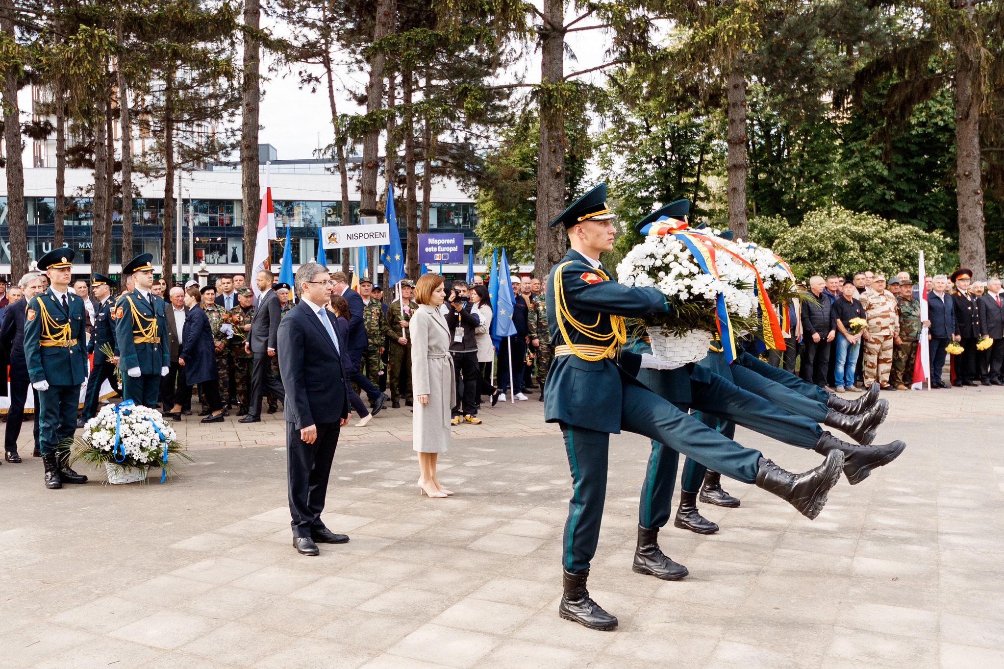 „Astăzi îi comemorăm pe pământenii noștri care au luptat în al Doilea Război Mondial pentru a readuce pacea pe continent. Astăzi sărbătorim pacea, pentru că 9 mai 1945 a fost prima zi de pace pe continentul nostru și astăzi sărbătorim Europa, Europa fiind cel mai durabil și cel mai de succes proiect de pace. Este o zi care ne amintește cât de vulnerabilă este pacea, cât de dramatic este războiul și că trebuie să facem absolut totul pentru ca să nu permitem războaie pe continent, în general în lume. Pentru R. Moldova, cel mai scurt drum spre o pace sustenabilă este integrarea în UE. Sărbătorim pacea și UE astăzi. În același timp, ne amintim de sacrificiul pe care l-au făcut înaintașii noștri pentru ca noi să putem trăi în pace”, a spus președinta Maia Sandu.