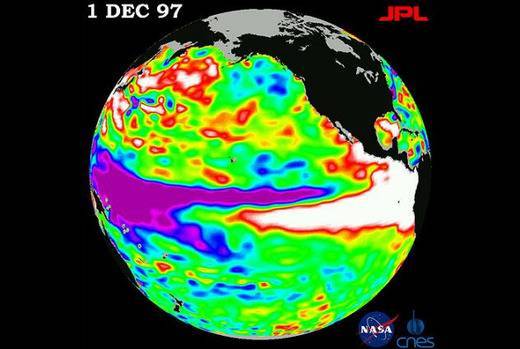 El Nino se produce atunci când vânturile care bat în mod normal, apele calde de est peste Pacificul ecuatorial îşi schimbă direcţia, permiţând creşterea temperaturii medii a apei marine. Schimbările acestea semi-neregulate în cele din urmă inversează şi, uneori, conduce la căderea temperaturii marine sub valorile medii, iar acest proces e cunoscut sub numele de La Nina-astfel finalizarea unei rotaţii.
