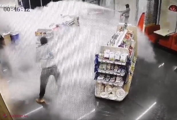 VIDEO // Momentul în care doi copii TÂLHĂRESC o benzinărie de la Ciocana, după ce umplu magazinul cu soluția pulverizată cu un extinctor