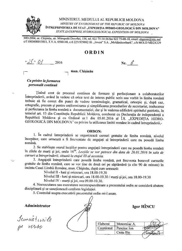 „Ținând cont de procesul continuu de formare și perfecționare a colaboratorilor, având în vedere că orice text de interes public scris sau vorbit în limba română trebuie să fie corect din punct de vedere terminologic, gramatical sau ortografic, precum și pentru uniformizarea și simplificarea procedurilor de secretariat, traducerea și perfectarea în limba română a documentației, dar și în vederea edificării spiritului patriotic”, a motivat Igor Hâncu necesitatea studierii limbii române pentru angajații întreprinderii „Expediția Hidro-geologică din Moldova”.