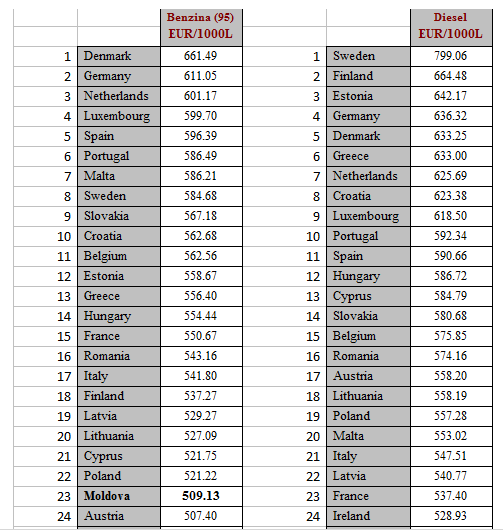 Astfel notăm ca prețurile la produsele petroliere în Republica Moldova sunt printre cele mai mici în Europa, iar țările care afișează prețuri mai mici, dispun de rafinării, pe când Republica Moldova importa 100% din produsele petroliere utilizate. De notat că prețul produselor petroliere în Romania, sursa principală de import este mult mai sus în clasamentul prețurilor în Europa.