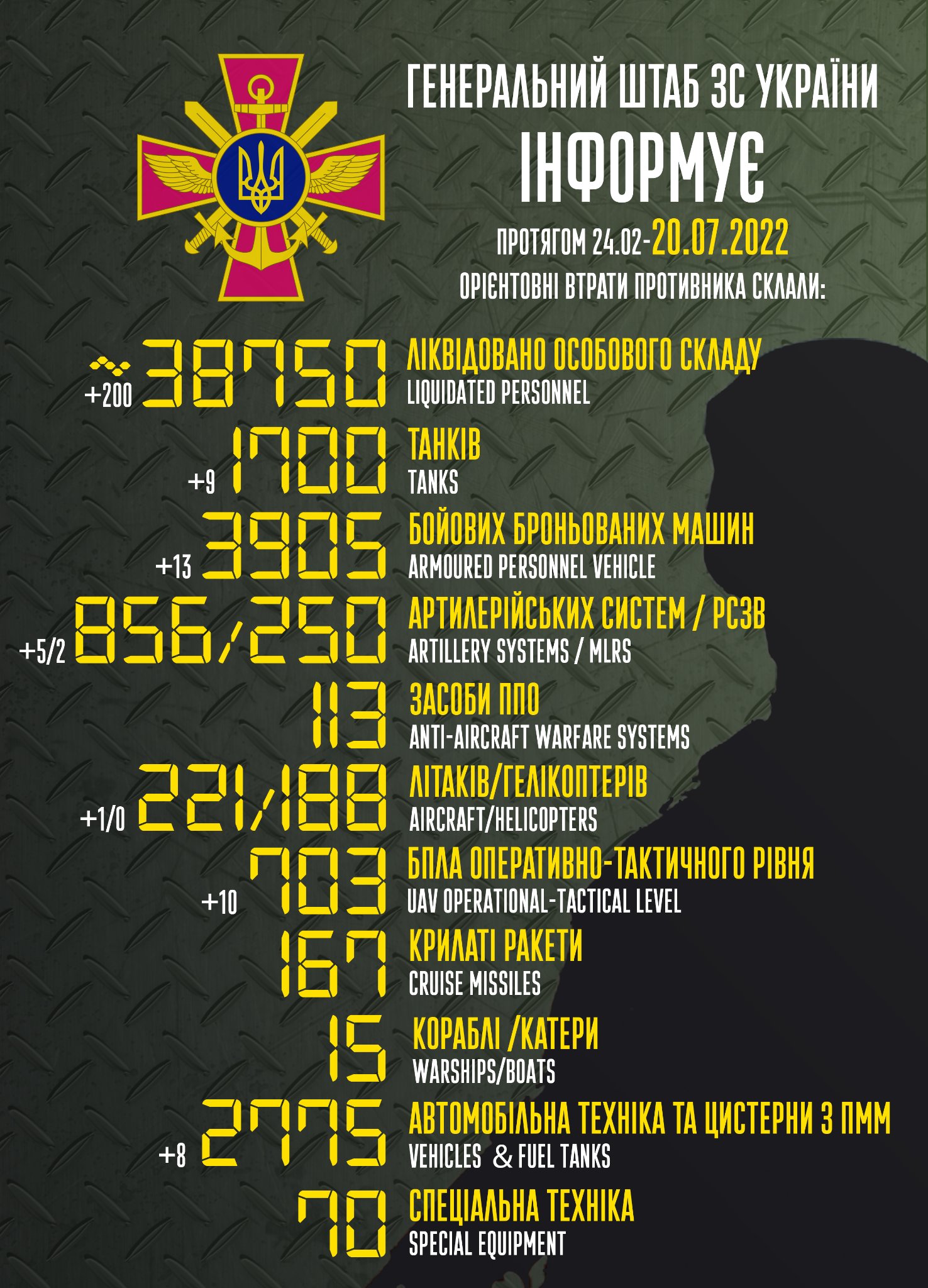 De menționat că de la începutul invaziei în Ucraina armata Federației Ruse ar fi pierdut în jur de 38 750 de militari, potrivit bilanțului prezentat astăzi, 20 iulie, de Statul Major al Armatei Ucrainei.