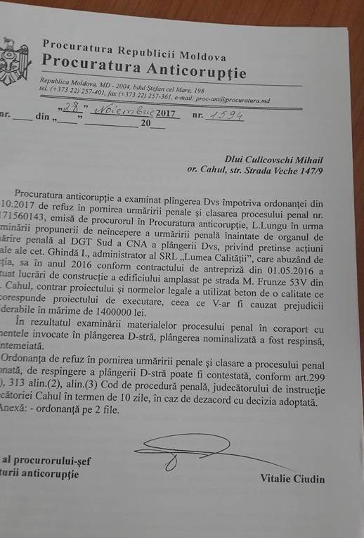 Înarmat cu expertize care arată că SRL „Lumea Calității” i-a construit necalitativ sediul și după numeroase adresări la ministerul de profil, la Procuratură, Centrul Național Anticorupție (CNA), agentul economic a atacat firma de construcții în judecată și s-a trezit cu controale inițiate de oamenii legii din Cahul.