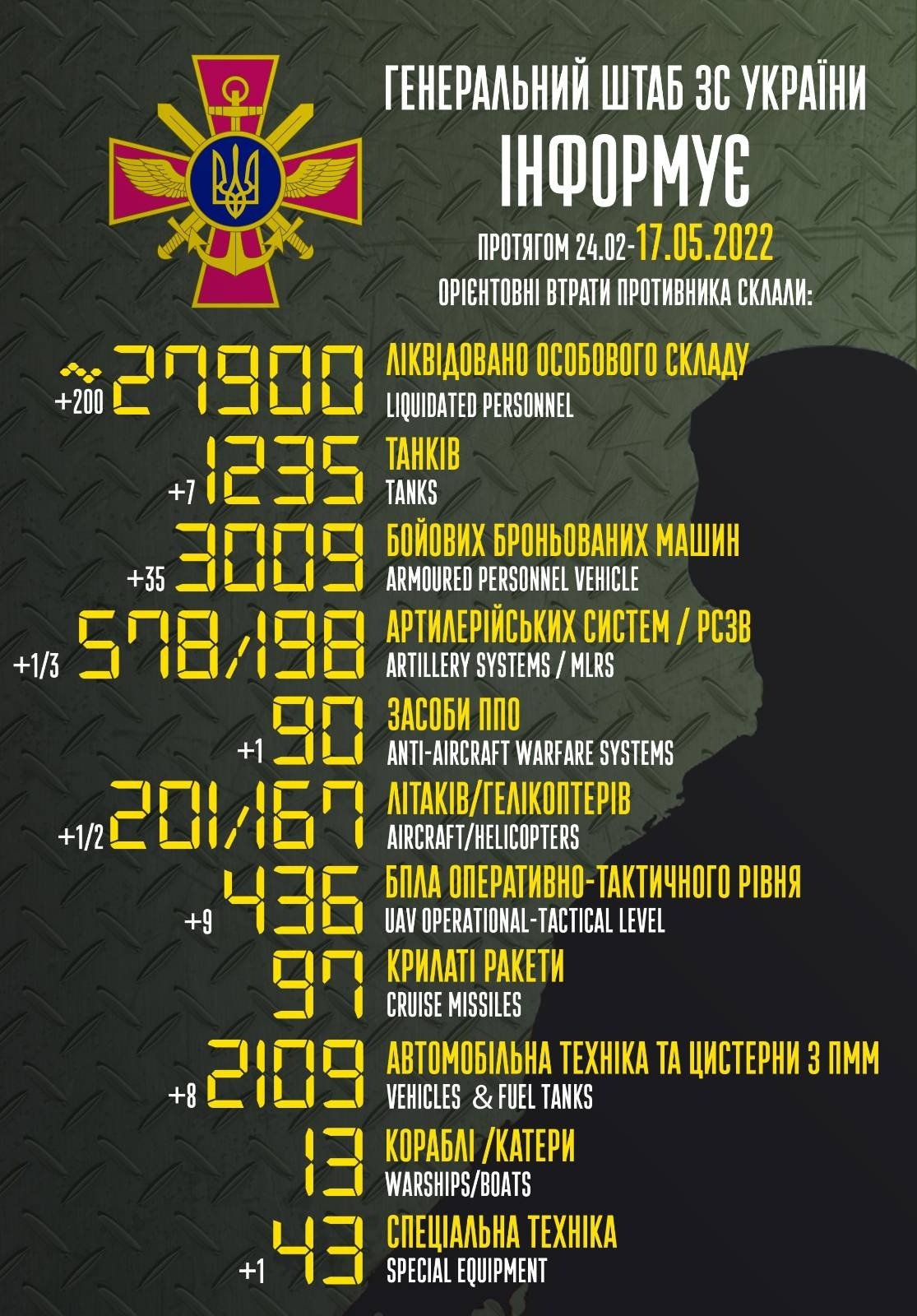 Potrivit sursei citate, în ultimele 24 de ore armata ucraineană ar fi distrus șapte tancuri ale invadatorilor ruși, dar și 35 de vehicule blindate. Totodată, au fost nimicite două elicoptere și un avion de luptă. Ucrainenii spun că au distrus nouă drone și opt vehicule de transport.