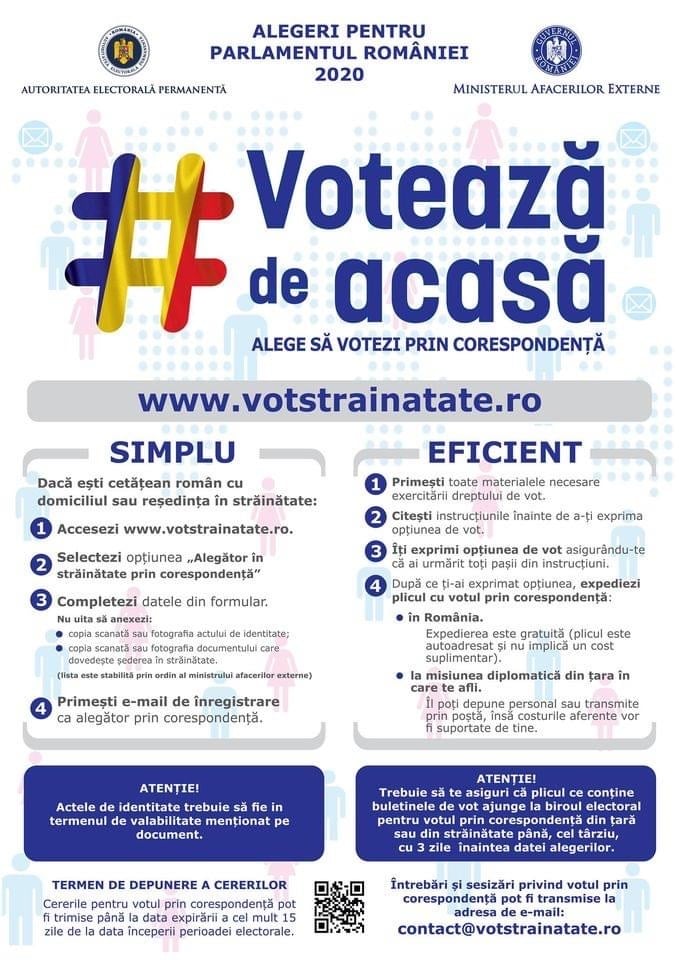 „Este sănătos, simplu și gratis să votați de acasă! Astfel, vă puteți exercita în mod democratic și în deplină siguranță dreptul Dumneavoastră constituțional. Varianta tradițională, adică votul exprimat la secțiile de votare, care, sperăm că vor putea fi, totuși, deschise în Republica Moldova, este supusă riscurilor majore ale infectării cu SARS Cov-2, așteptării îndelungate la coadă sau chiar imposibilității organizării în condiții de siguranță a procesului electoral, din cauza evoluțiilor impredictibile ale pandemiei”, se arată într-un comunicat de presă al Ambasadei României de la Chișinău.