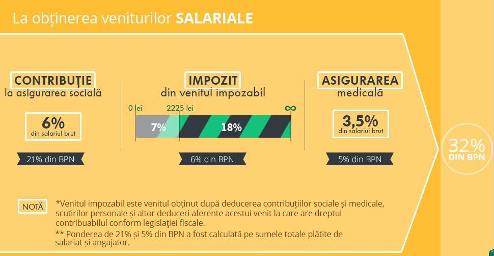 Din venitul salarial, contribuțiile sociale însumează 21% din BPN, cele din impozitul pe venit – 6% din BPN și din contribuțiile la asigurarea medicală – 5%, calculează budgetstories.md.