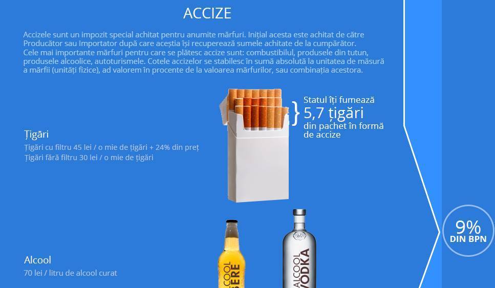 Data viitoare când faci cumpărături să ții minte că de regulă 16,67% din suma achitată este TVA, care la nivel de tară reprezintă 33% din BPN , iar când cumperi un pachet de țigări, să nu uiți că statul îți „fumează” 5,7 țigări, doar în formă de accize.