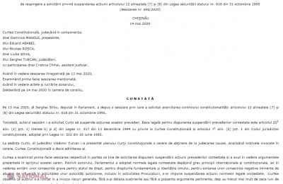 Curtea Constituțională (CC) a respins astăzi solicitarea de suspendare a acțiunii articolului 12 alineatele (7) și (8) din Legea securității statului, depusă de către deputatul Sergiu Sârbu la Înalta Curte.