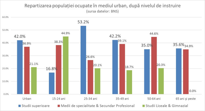 Astfel, în mediul urban, peste 53% dintre tinerii cu vârsta de 25-34 de ani, care reprezintă categoria celor care au intrat acum activ în câmpul muncii, au studii superioare.