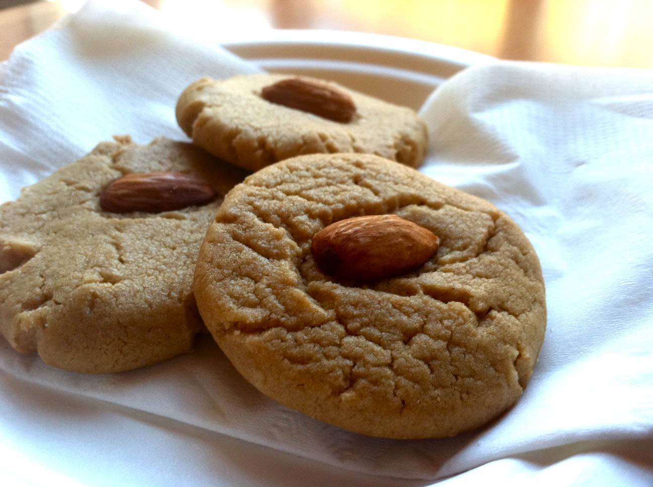 2. Din aluatul rezultat ia câte puţin şi modelează-l în mingi cu diametrul de 2 cm. Pune mingile pe o tavă şi turteşte-le, după care pune câte o migdală în mijlocul fiecărei mingi.
