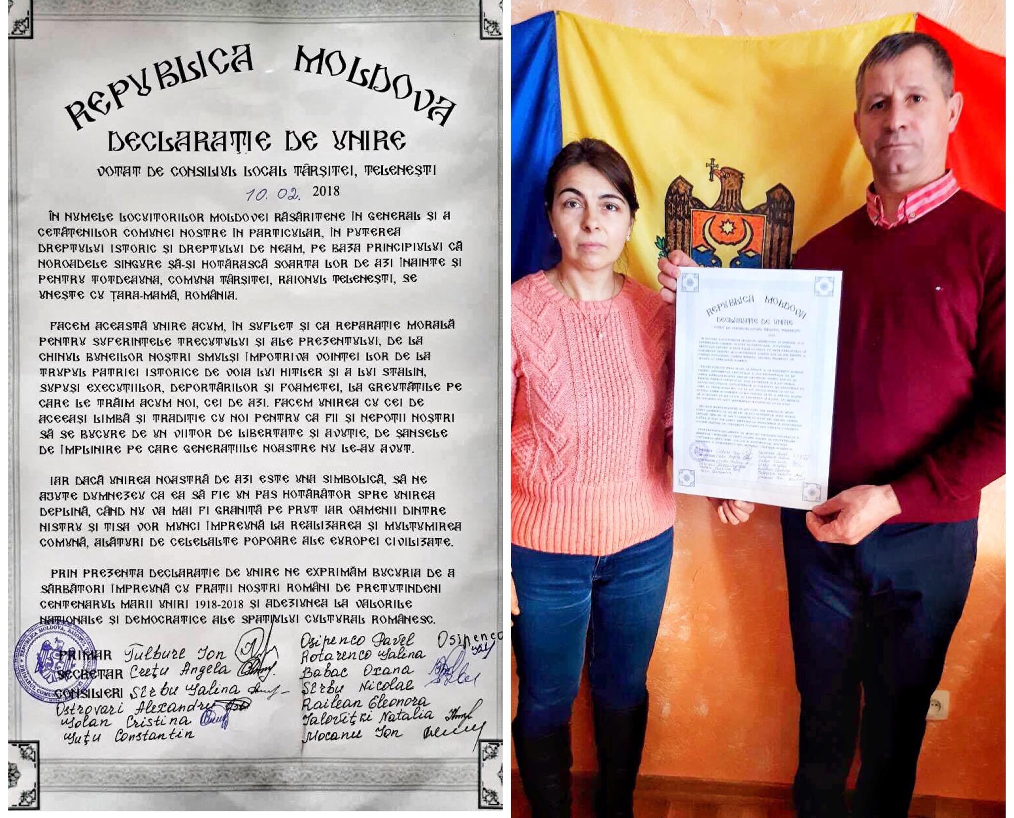 Și consiliul local din Târșiței, raionul Telenești, a votat Declarația de Unire. Printre semnatari se numără primarul localității, Ion Tulbure, secretarul consiliului Angela Crețu, dar și 12 consilieri.