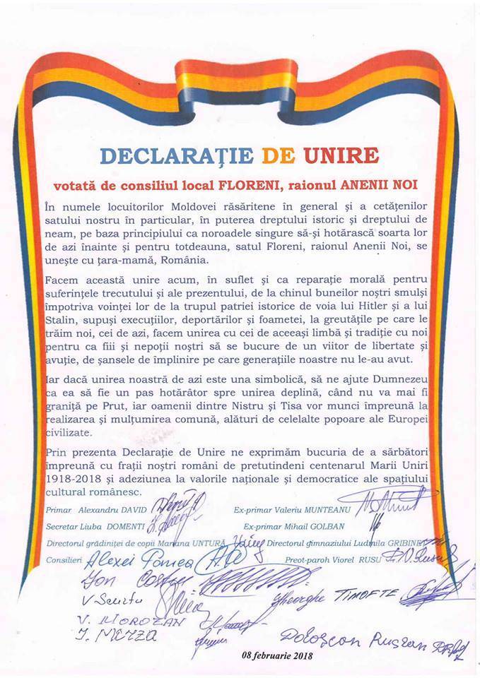 Comuna Codreanca, raionul Strășeni, satul Floreni din Anenii Noi, dar și localitatea Târșiței, Telenești, au semnat declarații de Unire cu România.