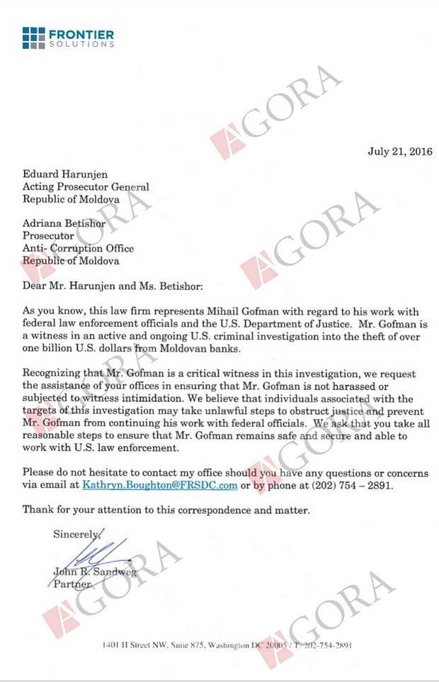 Precizăm că „Frontier Solutions” a expediat vinerea trecută o scrisoare similară și în adresa Procuraturii Generale din R. Moldova, solicitând ca fostul director adjunct al Serviciului Prevenirea și Combaterea Spălării Banilor din cadrul Centrului Național Anticorupție (CNA), Mihail Gofman, să nu fie intimidate, întrucât reprezintă un important martor în cadrul investigațiilor realizate de instituțiile americane pe faptul furtului din sistemul bancar moldovenesc.