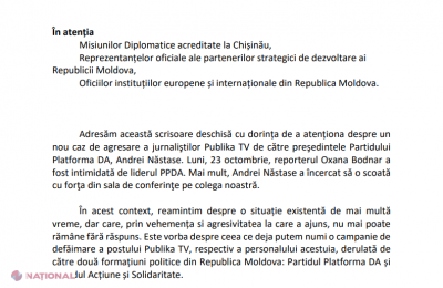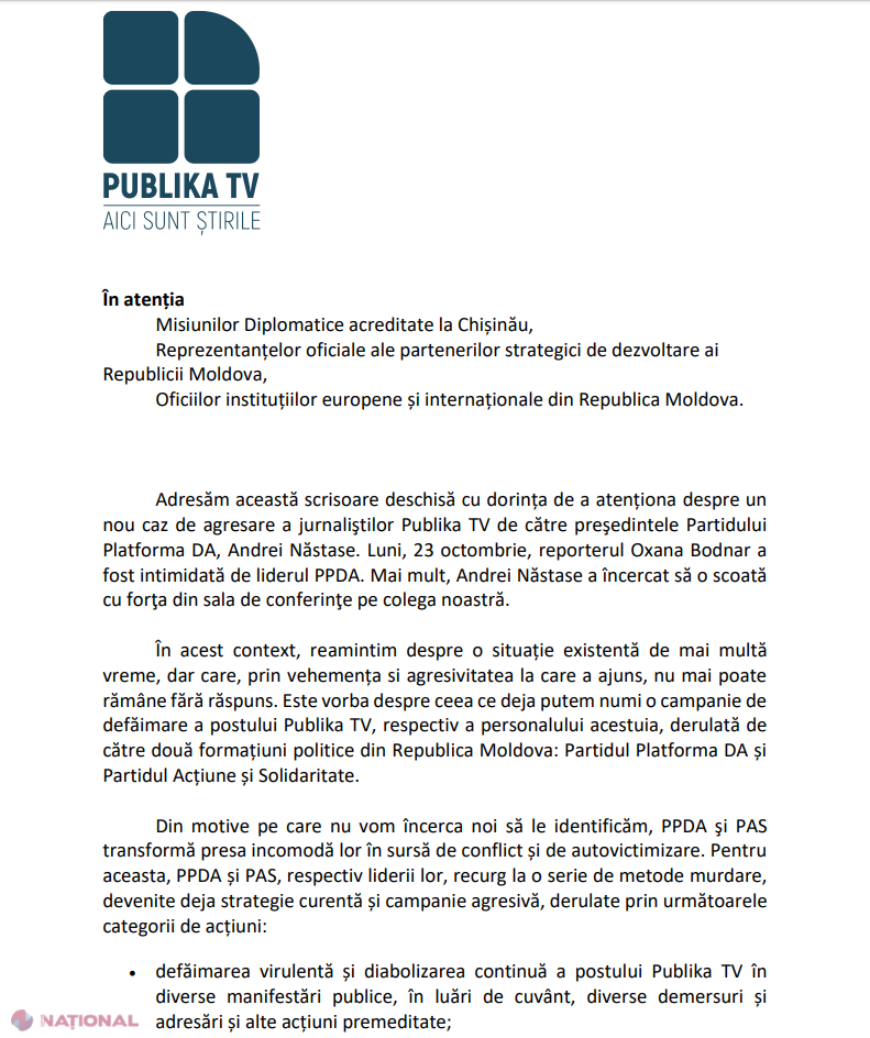 „Adresăm această scrisoare deschisă cu dorința de a atenționa despre un nou caz de agresare a jurnaliştilor Publika TV de către preşedintele PPDA, Andrei Năstase. Luni, 23 octombrie, reporterul Oxana Bodnar a fost intimidată de liderul PPDA. Mai mult, Andrei Năstase a încercat să o scoată cu forţa din sala de conferinţe pe colega noastră. În acest context, reamintim despre o situație existentă de mai multă vreme, dar care, prin vehemența si agresivitatea la care a ajuns, nu mai poate rămâne fără răspuns. Este vorba despre ceea ce deja putem numi o campanie de defăimare a postului Publika TV, respectiv a personalului acestuia, derulată de către două formațiuni politice din R. Moldova: PPDA și PAS”, se arată în scrisoare.