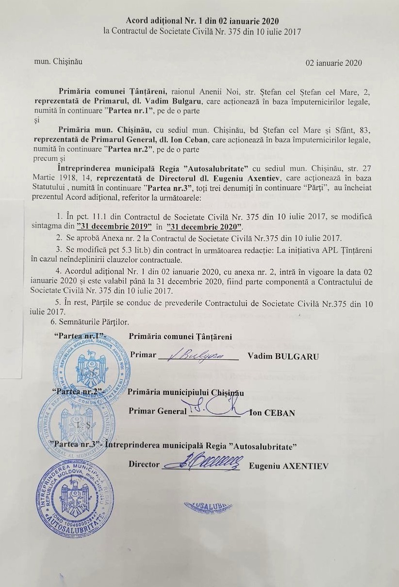 Totuși, acest contract va putea fi desfăcut de către administrația publică din Țânțăreni, dacă Primăria Chișinău nu-și va onora obligațiunile asumate.