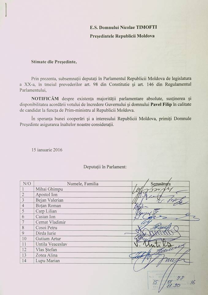 Facebook Un număr de 55 de deputați din Parlamentul R. Moldova au semnat pentru ca Pavel Filip să fie propus la funcția de prim-ministru. Spre deosebire de prima listă, prin care 56 de deputați semnau pentru crearea unei majorități parlamentare care l-a înaintat pe Vlad Plahotniuc la funcția de premier, lipsește semnătura unui singur deputat, liberal-democrata Aliona Goța.