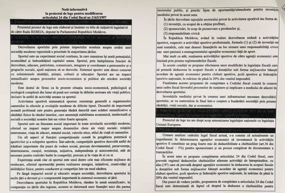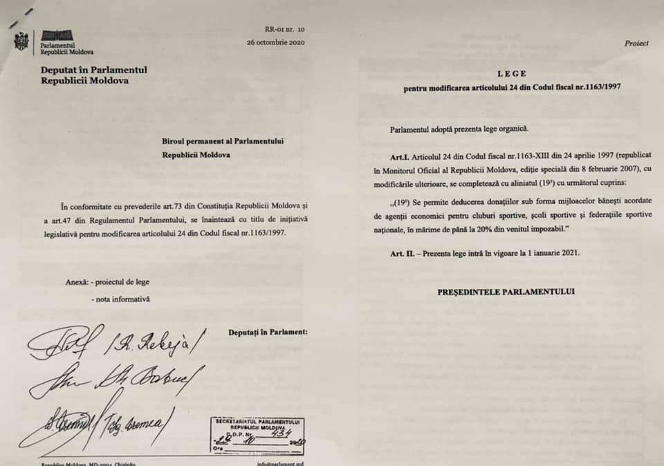 Facebook Agenții economici care vor investi în dezvoltare sportului din R. Moldova ar putea beneficia de facilități fiscale importante. O inițiativă legislativă în acest sens a fost înregistrată astăzi de fostul căpitan al echipei naționale de fotbal, deputatul Radu Rebeja, dar și de colegii săi Monica Babuc și Igor Vremea.