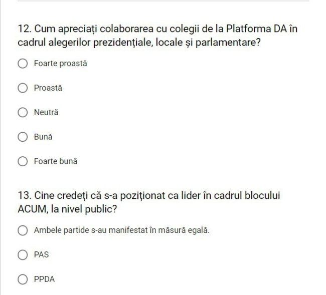 Totodată, pe Maia Sandu o interesează cine, în opinia membrilor formațiunii sale, s-a poziționat ca lider în cadrul Blocului „ACUM”, la nivel public – PAS, PPDA sau ambele, în măsură egală? Membrii PAS mai sunt întrebați ce fel de coaliție își doresc, iar printre opțiuni se numără: „ACUM” – PSRM; „ACUM” – PD, Guvern minoritar „ACUM” votat de PSRM, Guvern tehnocrat votat cu PSRM.