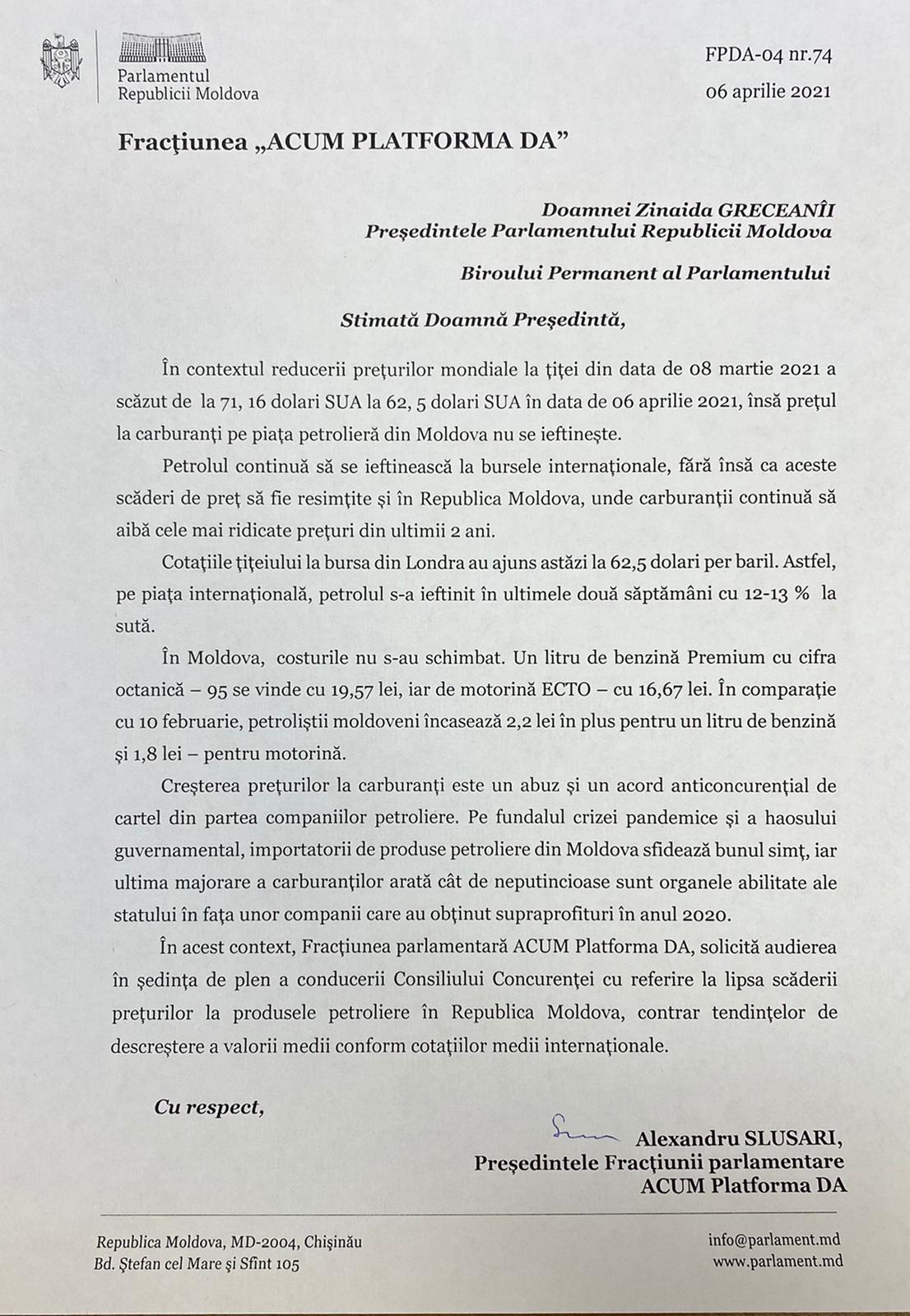 „Ultima majorare a carburaților arată cât de neputincioase sunt organele abilitate ale statului în fața unor companii care au obținut supraprofituri în 2020. În acest context, solicităm audierea conducerii Consiliului Concurenței în plenul Parlamentului”, a conchis Alexandru Slusari.