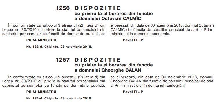 Documentele publicate în Monitorul Oficial nu precizează motivele eliberării din funcție a celor doi. E stipulat că atât Octavian Calmâc, cât și George Balan sunt eliberați din funcție începând cu 30 noiembrie curent.