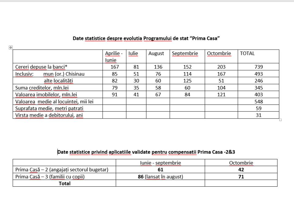 Numărul de beneficiari ai Programului „PRIMA CASĂ” a ajuns la 2 282. Aceștia au accesat credite de peste un miliard de lei și au primit garanții de stat de circa 600 de milioane de lei