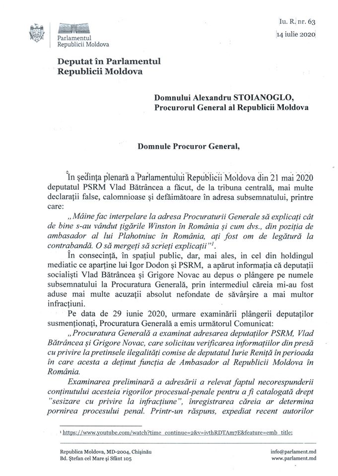 Deputatul Iurie Reniță îi solicită procurorului general, Alexandru Stoianoglo, să-i cerceteze penal pe socialiștii Vlad Batrîncea și Grigore Novac, care au depus împotriva sa un denunț fals și l-au numit „conserva lui Plahotniuc”.