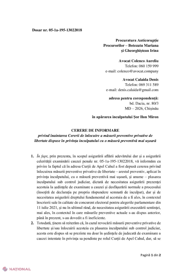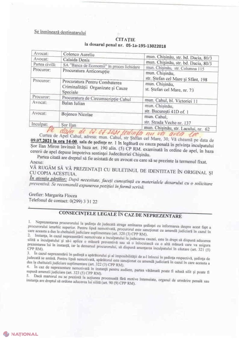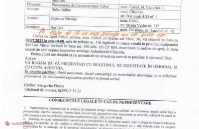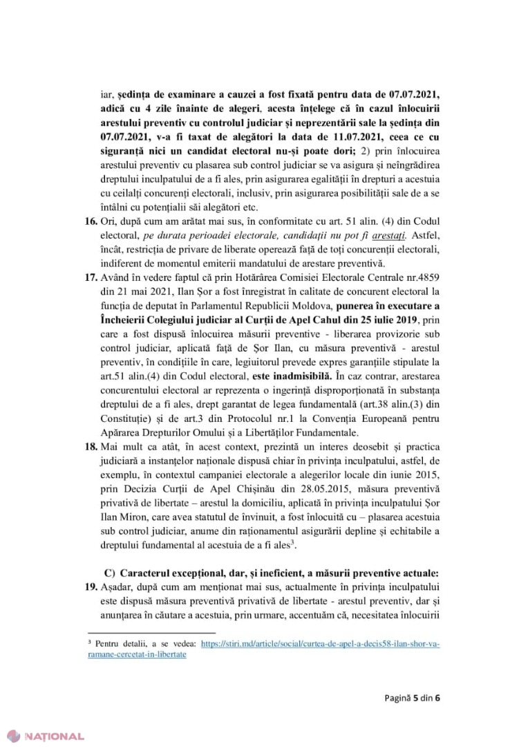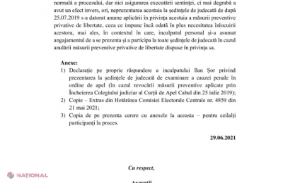 Liderul Partidului „ȘOR”, Ilan Șor, solicită Curții de Apel din Cahul să anuleze mandatul de arestare emis pe numele său, astfel încât să i se ofere posibilitatea de a participa în campania electorală pentru alegerile parlamentare anticipate din 11 iulie. Solicitarea vine după ce instanța de judecată a decis să amâne ședința programată pentru 7 iulie pentru data de 9 iulie, adică în ultima zi a campaniei electorale. În consecință, Ilan Șor spune că, practic, „a fost lipsit ”de dreptul de a participa la evenimentele electorale.