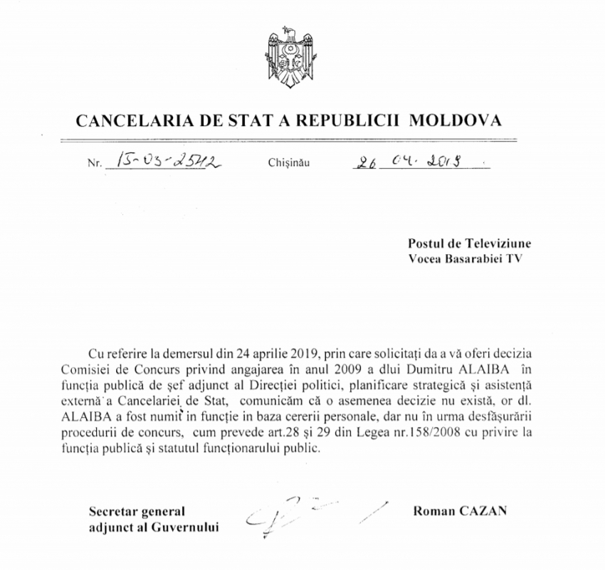 „Cu referire la demersul din 24 aprilie 2019, prin care solicitaţi de a vă oferi decizia Comisiei de Concurs privind angajarea în anul 2009 a dlui Dumitru ALAIBA în funcţia publică de şef adjunct al Direcţiei politici, planificare strategică şi asistenţă externă a Cancelariei de Stat, comunicăm că o asemenea decizie nu există, or dl. ALAIBA a fost numit în funcţie în baza cererii personale, dar nu în urma desfăşurării procedurii de concurs, cum prevede art. 28 şi 29 din Legea nr. 158/2008 cu privire la funcţia publică şi statutul funcţionarului public”, se arată în răspunsul Cancelariei de Stat.