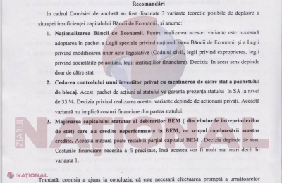 Comisia de anchetă recomandă mai multe soluții pentru redresarea situației de la BEM: naționalizarea băncii, cedarea de către stat a pachetului de acțiuni majoritar, cu păstrarea unui pachet de blocaj sau majorarea capitalului statutar al debitorilor BEM (din rândul întreprinderilor de stat) care au credite neperformante la BEM, cu scopul rambursării acestor credite.