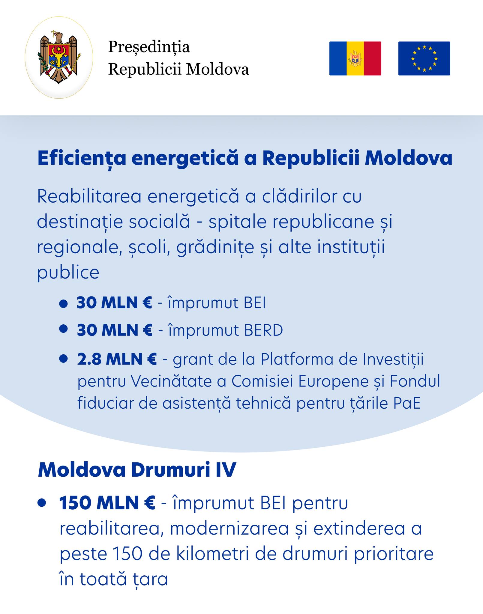 „Lansăm un program național de reabilitare energetică a clădirilor din toată R. Moldova, cu accent pe clădirile cu destinație socială. Beneficiare sunt instituțiile publice de importanță națională, precum spitalele republicane, și cele de importanță locală și municipală - grădinițe, școli, spitale municipale și raionale. Doar prin reabilitarea instituțiilor spitalicești, anual, vor avea parte de servicii mai bune peste 250 000 de pacienți, iar statul va economisi cel puțin 5,2 milioane de euro. Proiectul presupune acordarea a două împrumuturi de câte 30 de milioane de euro de la BEI și BERD și a unui grant de 2,8 milioane de la Platforma de Investiții pentru Vecinătate a Comisiei Europene și de la Fondul fiduciar de asistență tehnică pentru țările PaE”, a scris Maia Sandu pe Facebook.