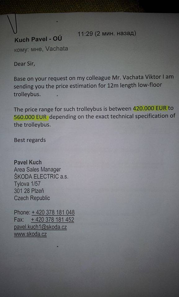 Dorin Chirtoacă a prezentat pe profilul său de facebook un document prin care întreprinderea producătoare din Cehia confirmă că un troleibuz costă între 420 și 560 de mii de euro, în funcție de dotările tehnice.