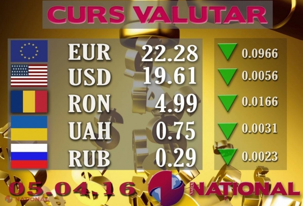 Banca Națională a Moldovei a stabilit pentru ziua de astăzi un curs oficial de 22.28 de lei ...