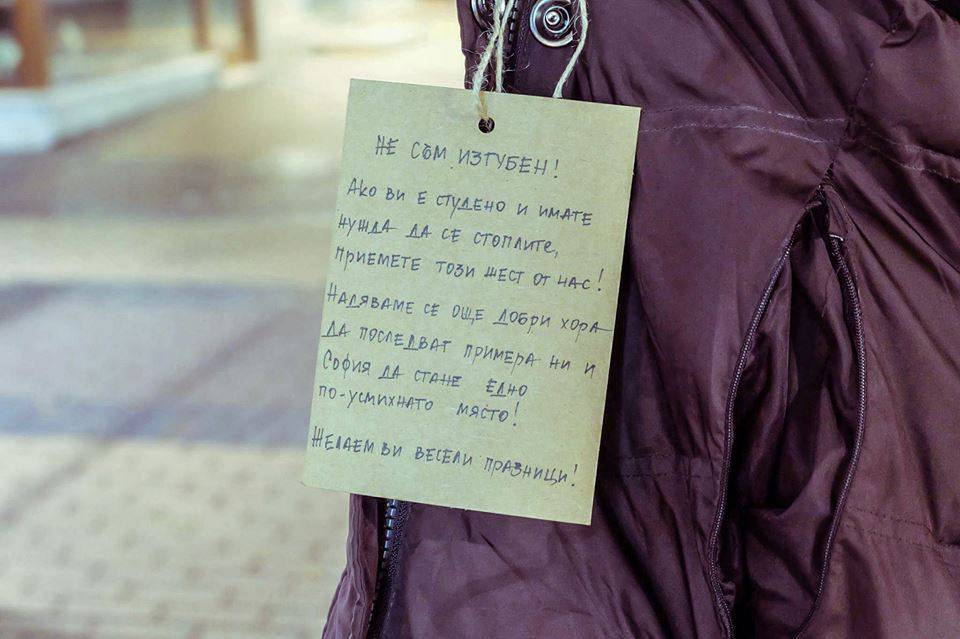 „Îmbrac-o și încălzește-te! Este un mic dar din partea mea! Ne-am dori ca și alții să preia acest exemplu. Sărbători fericite!”, scrie pe bilețele.