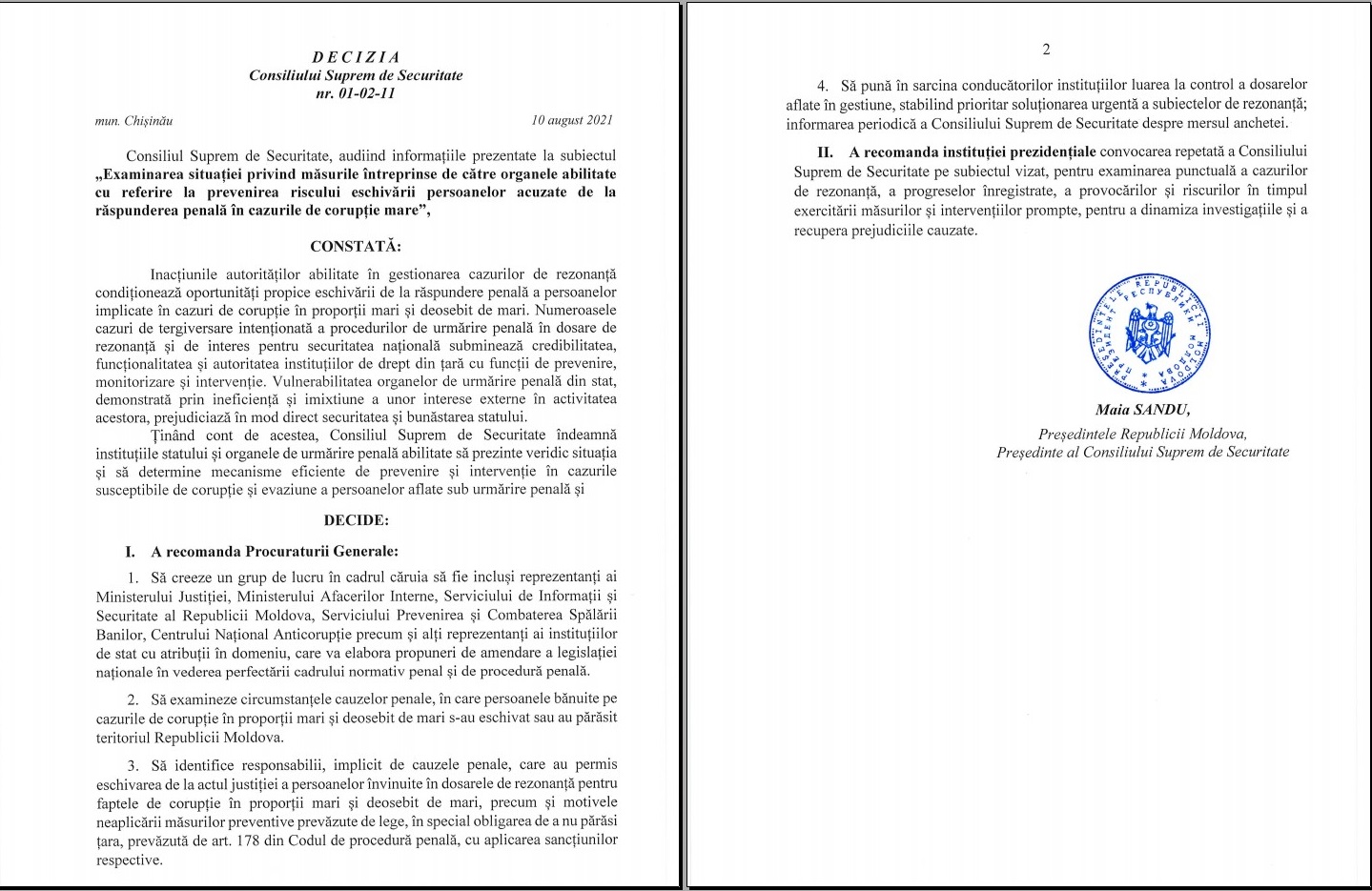Președintele Maia Sandu a acuzat Procuratura Generală de ineficiență în ceea ce privește investigarea cazurilor de mare corupție din R. Moldova, iar Consiliul Suprem de Securitate (CSS), convocat pe 10 august curent, a făcut mai multe recomandări la adresa acestei instituții pentru a stabili inclusiv circumstanțele în care persoanele învinuite în dosare de rezonanță au părăsit teritoriul republicii și se eschivează de la actul justiției.