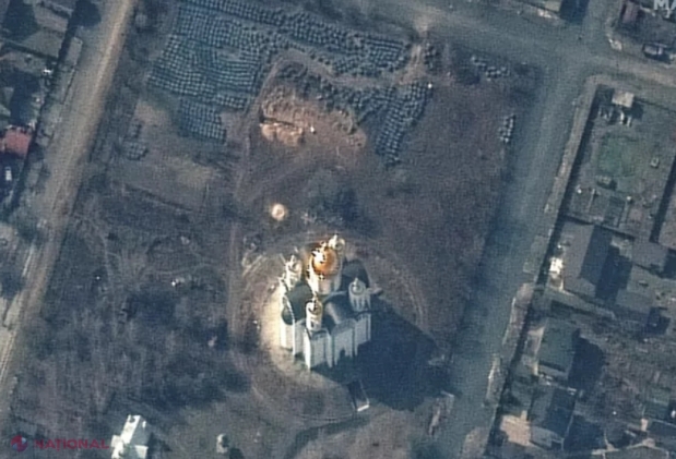 FOTO // Imaginile din SATELIT arată un sanț lung de 13 metri lângă biserica din Bucha, pe locul în care a fost descoperită o groapă comună. Procurorii au găsit 410 cadavre în orașele din apropierea Kievului