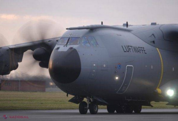 Un avion militar cargo Airbus A400M din dotarea forţelor aeriene germane, pe pista Bazei aeri...