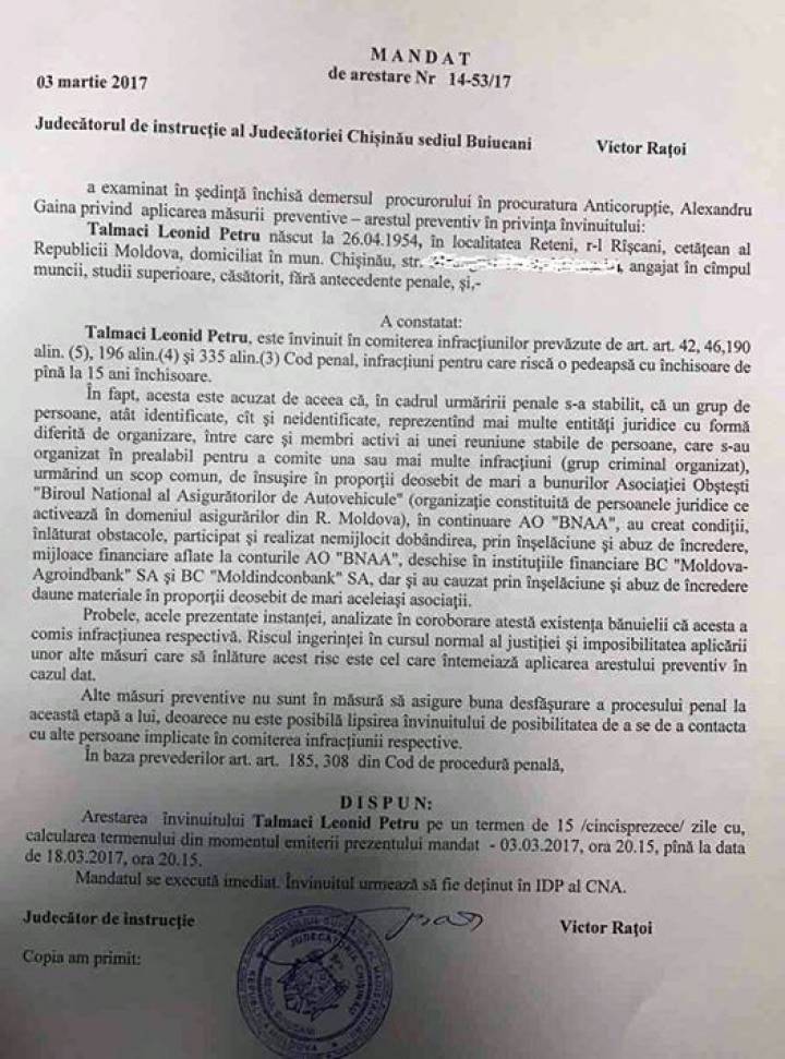 Primul și cel mai longeviv guvernator al Băncii Naționale a Moldovei (BNM), Leonid Talmaci, a fost reținut, ieri-seară, de către procurorii anticorupție. Acesta a fost plasat în arest preventiv, pe un termen de 15 zile, în izolatorul Centrului Național Anticorupție (CNA), fiind învinuit de participarea într-un grup specializat în escrocherii în proporţii deosebit de mari.