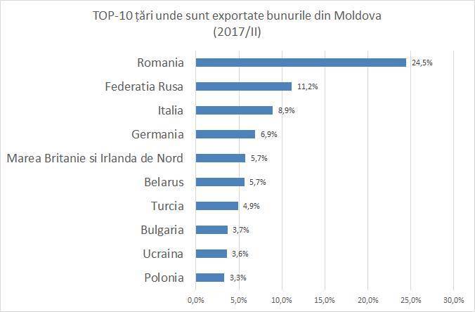 Dacă în 2013 R. Moldova a exportat în Rusia produse în valoare de 691 de milioane de dolari, în ultimul an au plecat în România mărfuri autohtone în valoare de 549 de milioane de dolari, în timp ce în Federația Rusă au scăzut până la 252 de milioane.