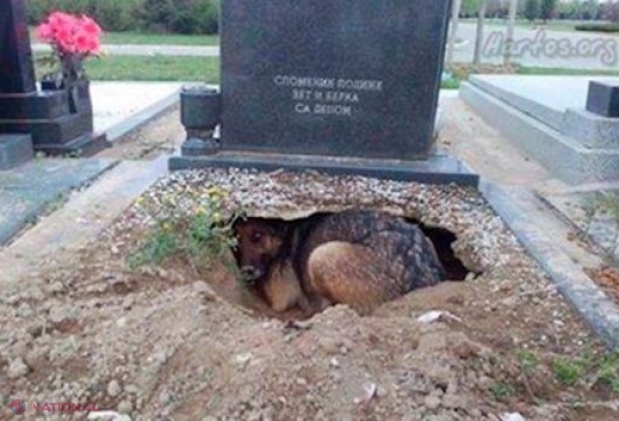 FOTO // Câinele fotografiat în timp ce stătea sub o piatră funerară dintr-un CIMITIR nu-şi plângea stăpânul, cum s-a spus. Animalul păzea un SECRET
