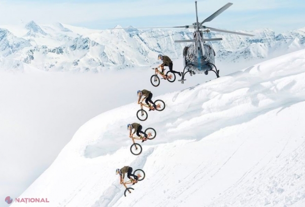 Curaj extrem al unui sportiv: a sărit pe bicicletă din elicopter, apoi a făcut o cursă specta...
