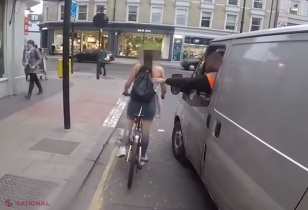 Doi bărbați aflați într-un van s-au luat de o biciclistă care aștepta culoarea verde a semafo...