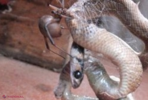 FOTO // Momentul TERIFIANT în care un şarpe, prins în pânza mortală a unui păianjen, este devorat