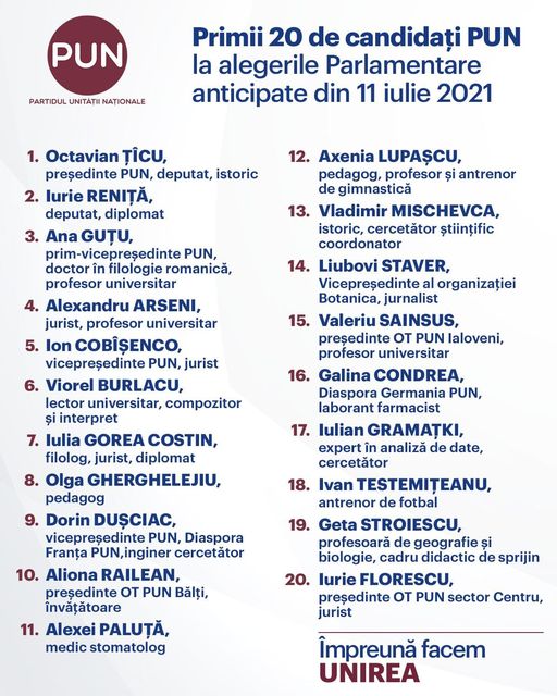 CITIȚI și ȘAPTE doctori şi doctori habilitați în ştiințe în primii 20 de candidați ai PUN la alegerile din 11 iulie: „Alegerile din 11 iulie vor defini angajamentul cetățenilor R. Moldova de a promova în prim-planul vieții politice personalități integre”