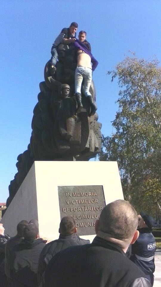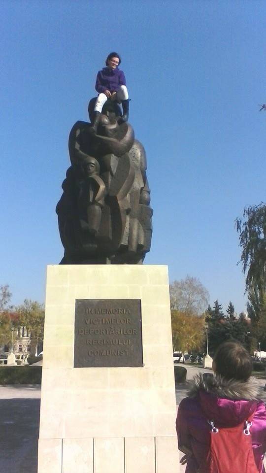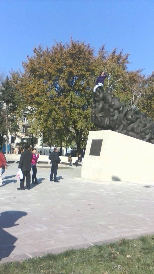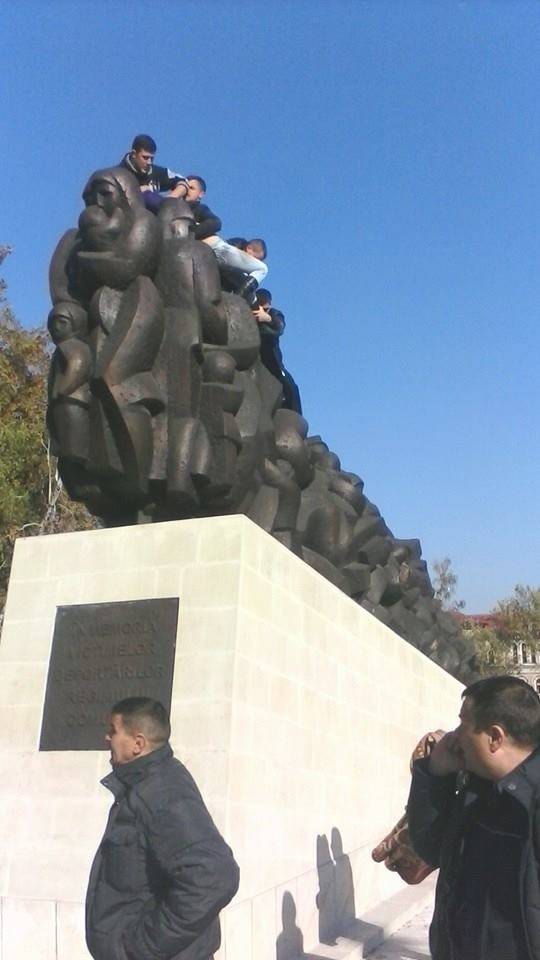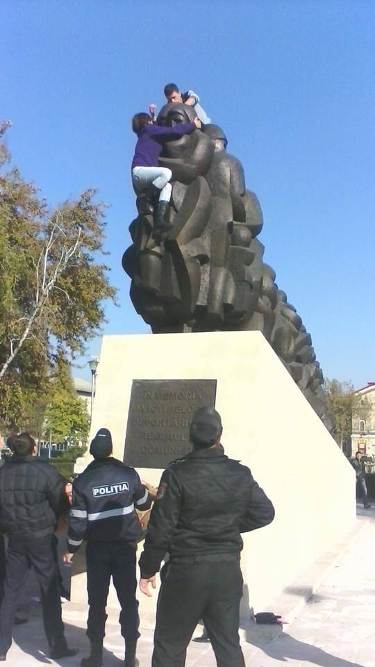 facebook.com / Viorica Tătaru O tânără a făcut astăzi spectacol în scuarul din fața Gării din Chișinău, amenințând să se sinucidă sărind de pe monumentul deportaților „Trenul durerii”. Motivul invocat de ea este că nu vrea în Uniunea Europeană.
