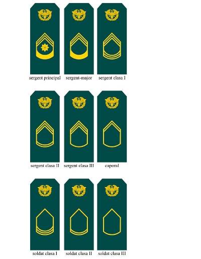 Potrivit decretului, „însemnele de grad militar pentru efectivele de soldați și sergenți ai Armatei Naționale se compun din galoane unghiulare în formă de căprior, galoane în formă de arc concav și stele cu opt raze, ordonate în pal și unite sau nu lateral prin galoane verticale.