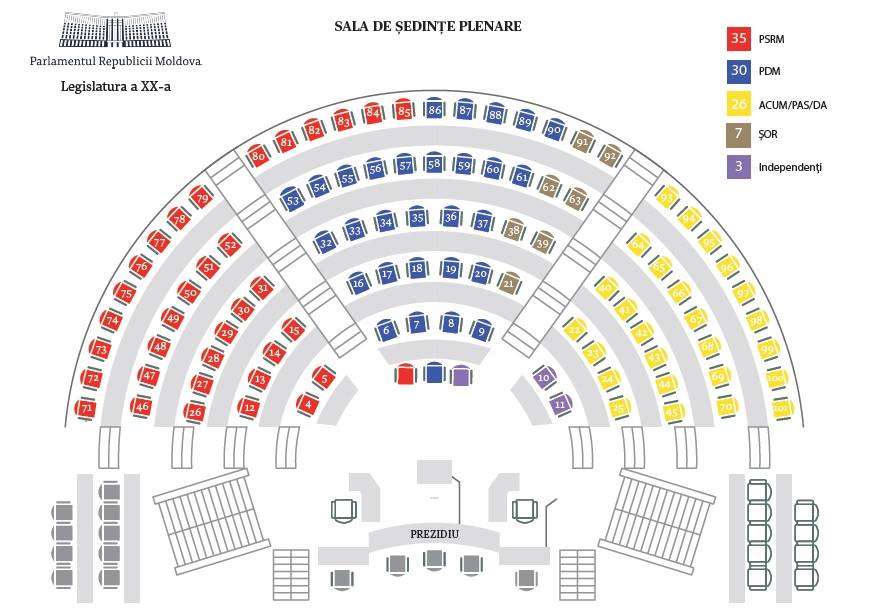 Legislatorii din Blocul „ACUM” vor ocupa sectorul 3, cel din dreapta sălii, alături de ceilalți doi independenți, plasați în primul rând.