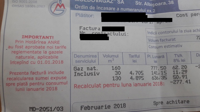 Cetățenii R. Moldova au început să primească facturile pentru gazele naturale consumate în luna februarie curent, cu recalculări pentru luna ianuarie.