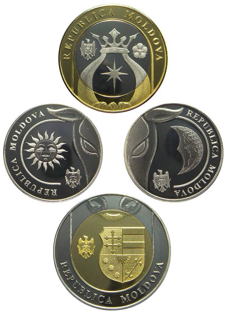 Pe revers, alăturarea monedelor reconstituie imaginea stemei de stat a Republicii Moldova.