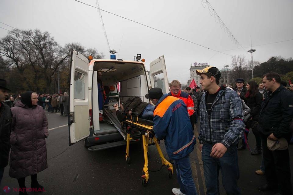 Doi manifestanţi din randurile comuniştilor au fost luaţi de ambulanţă. Unul dintre aceştia era plin de sânge.